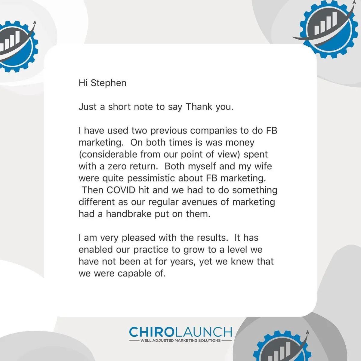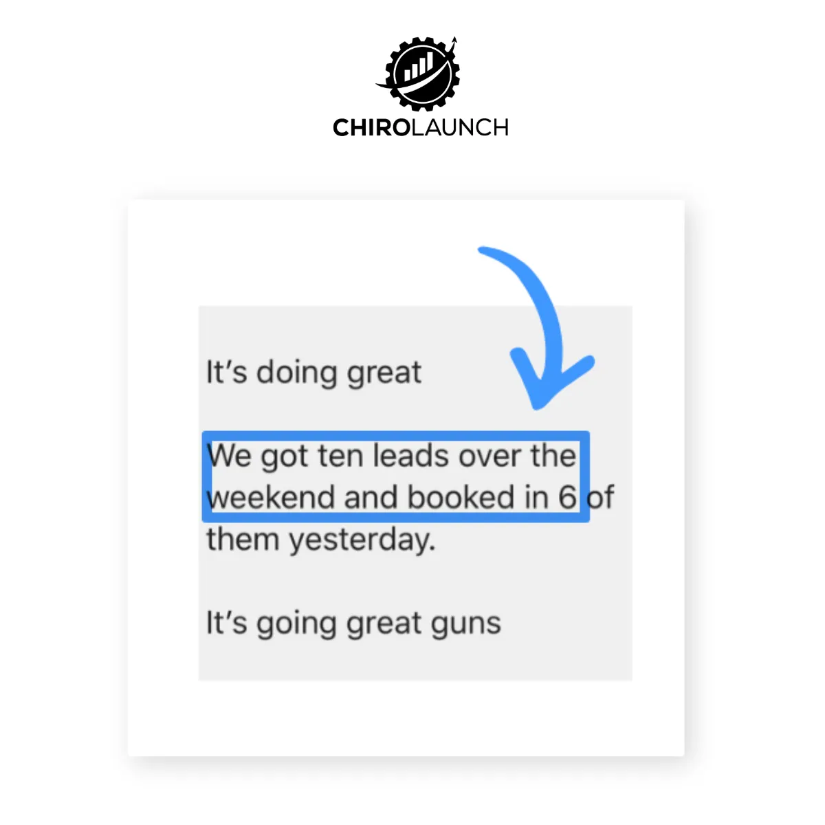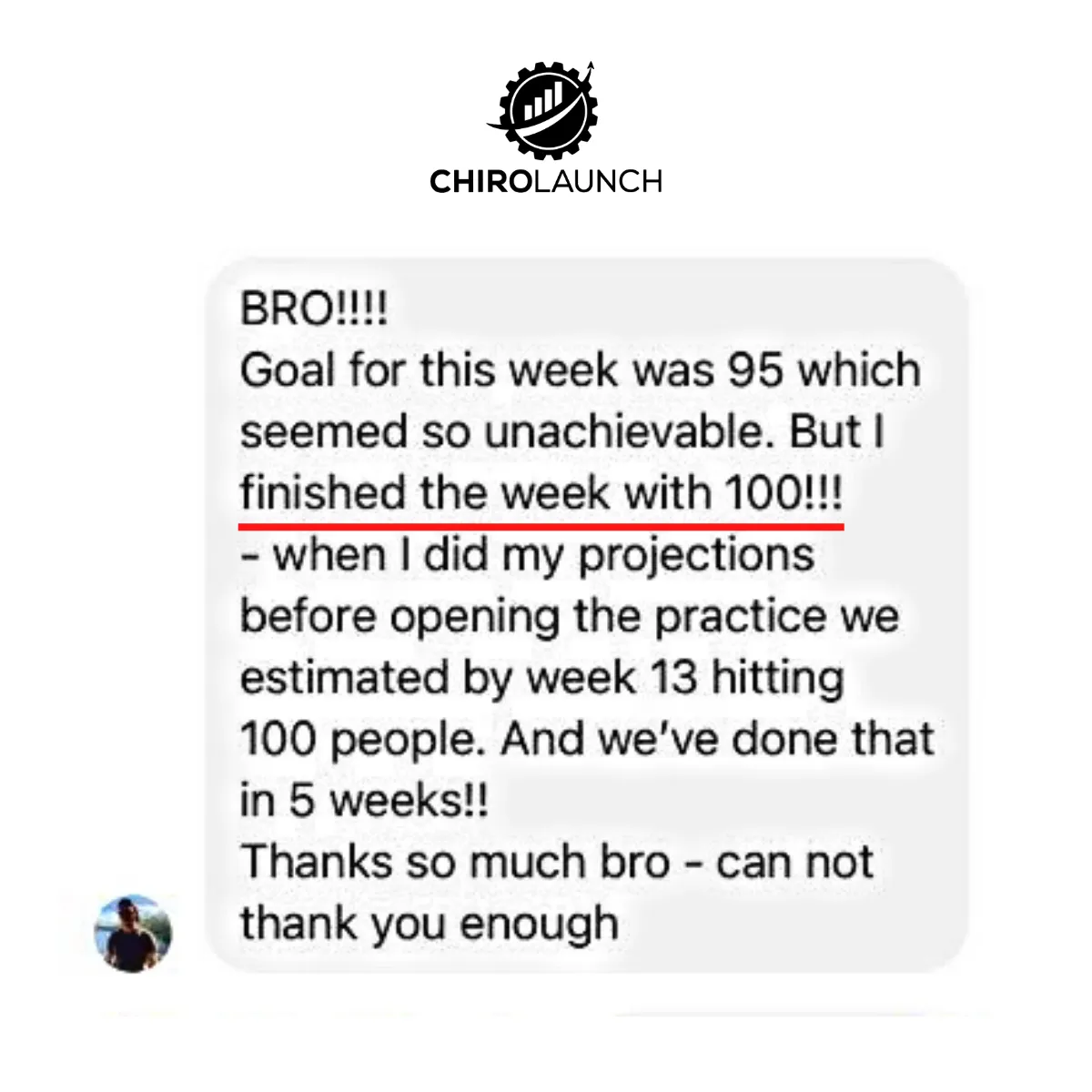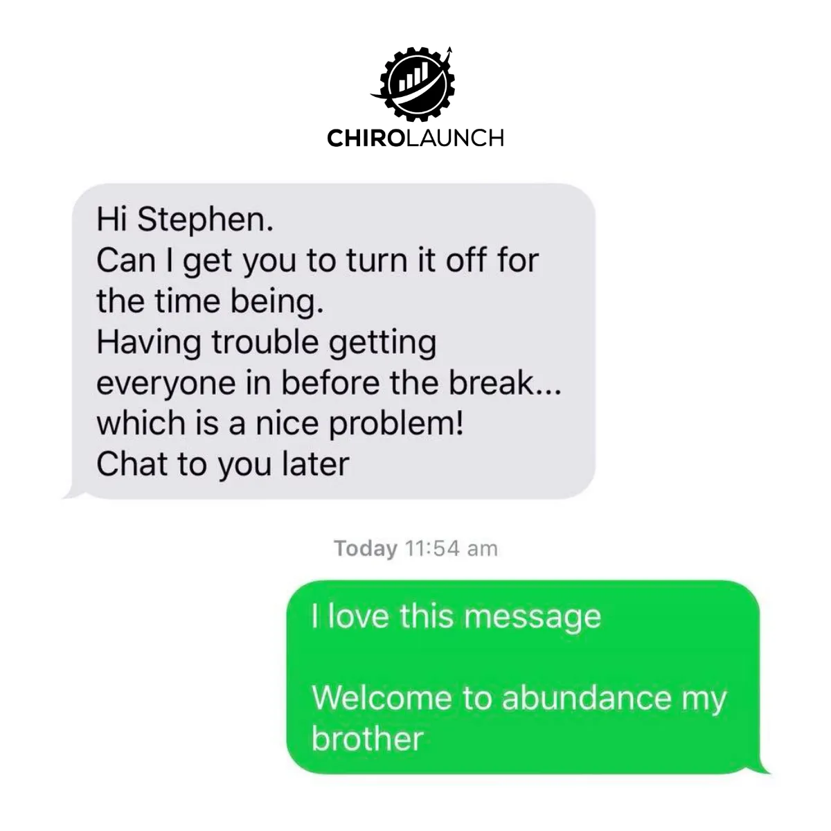 "Best sales process ever! Me and your guy Ryan talked for months - I was thinking of buying a new practice and he was doing market research for me to figure out the best location/demographic for it - I never paid a dime. He was great. I finally decided to hold off and decided to do spinal decompression in my current location, and decided to get into coaching with Dr. Stephen as well. One month in, we had 60 booked appointments, with about 18 who have signed up, and more than $40,000 in revenue for that first month"." - Dr. Tom