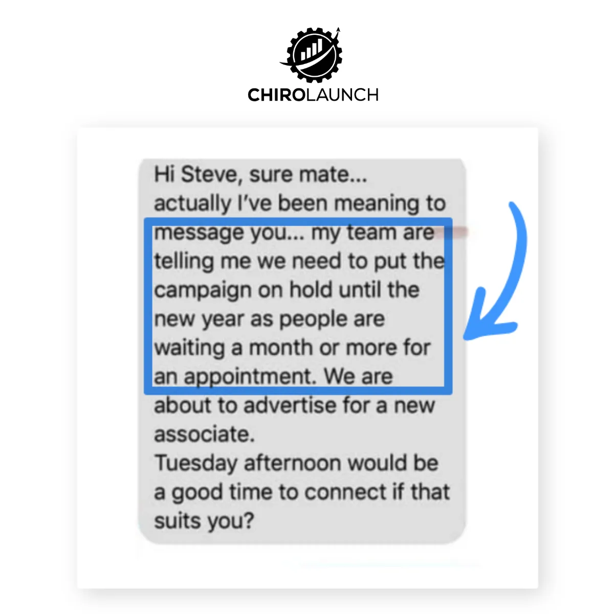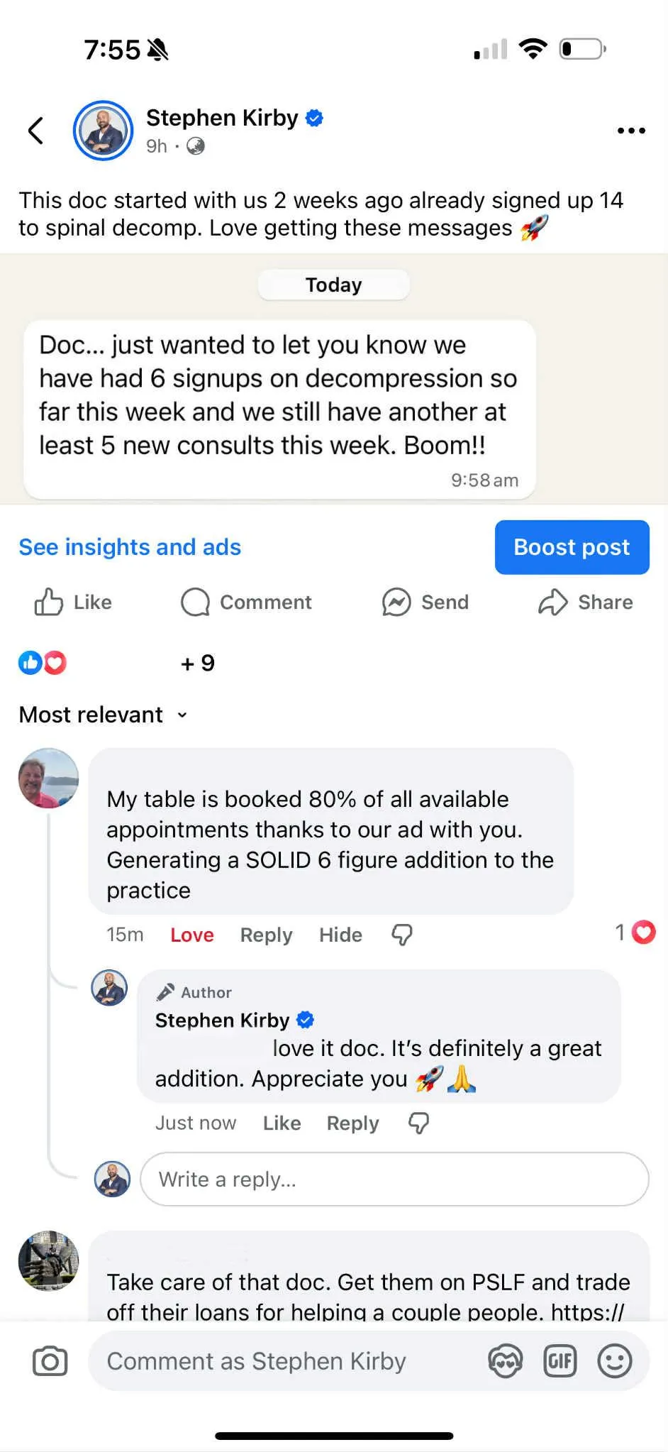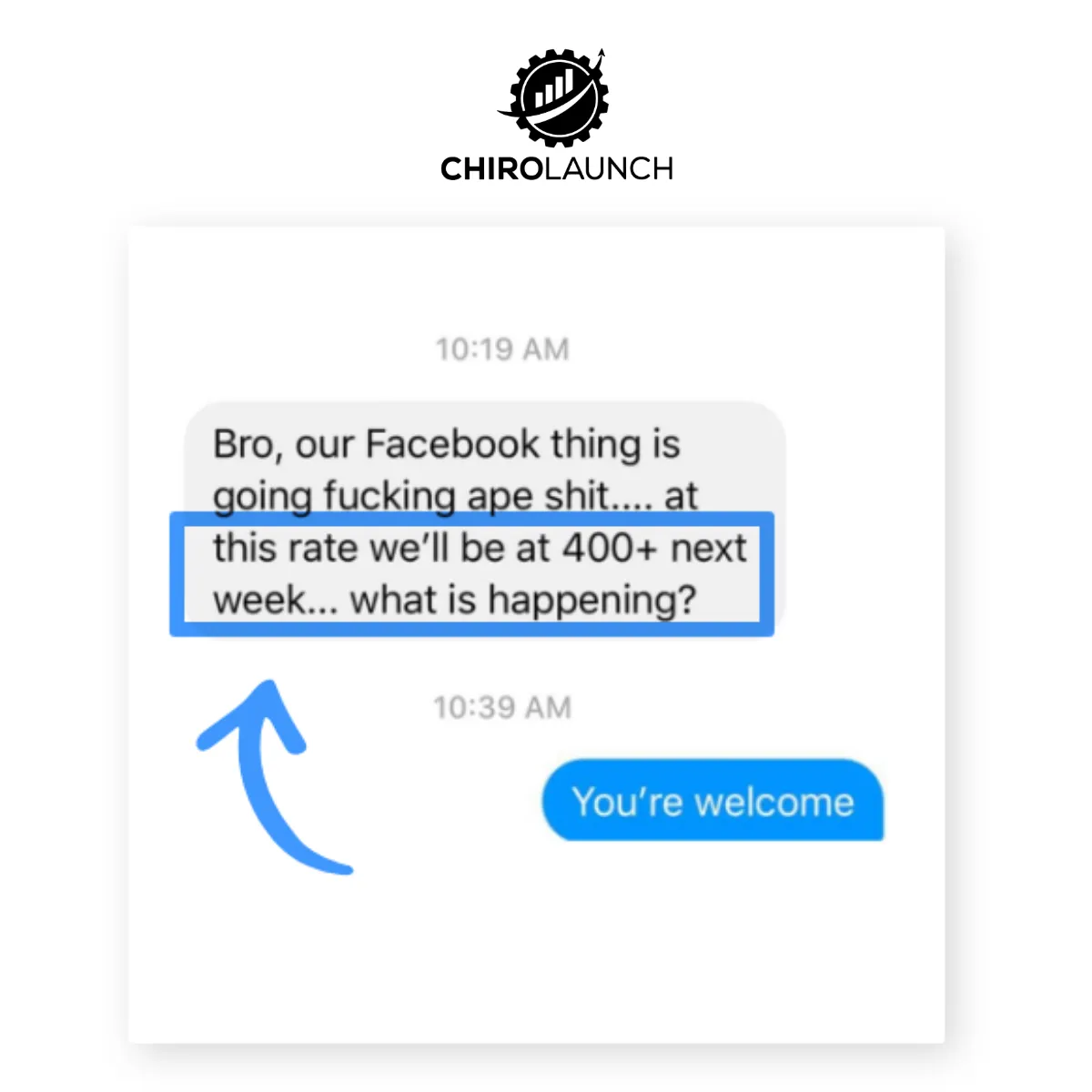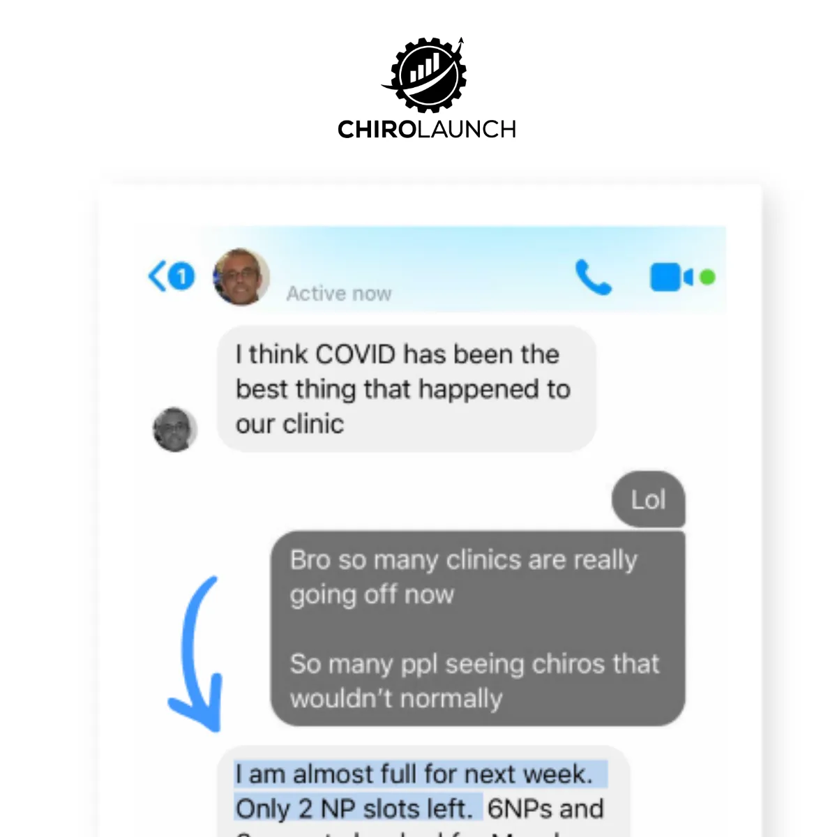 "Best sales process ever! Me and your guy Ryan talked for months - I was thinking of buying a new practice and he was doing market research for me to figure out the best location/demographic for it - I never paid a dime. He was great. I finally decided to hold off and decided to do spinal decompression in my current location, and decided to get into coaching with Dr. Stephen as well. One month in, we had 60 booked appointments, with about 18 who have signed up, and more than $40,000 in revenue for that first month"." - Dr. Tom
