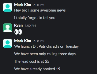 "You were the only agency out there that not only didn't try to sell me, overpromise, hype up.. you were very clear, professional and gave me exactly what I wanted out of this. I was expecting about 5-10 appointments in our first month, I know how marketing works.. but with you guys, we got 16 in the first 2 and a half weeks alone. I'm like - wait.. I am s w a m p e d!" - Dr. John